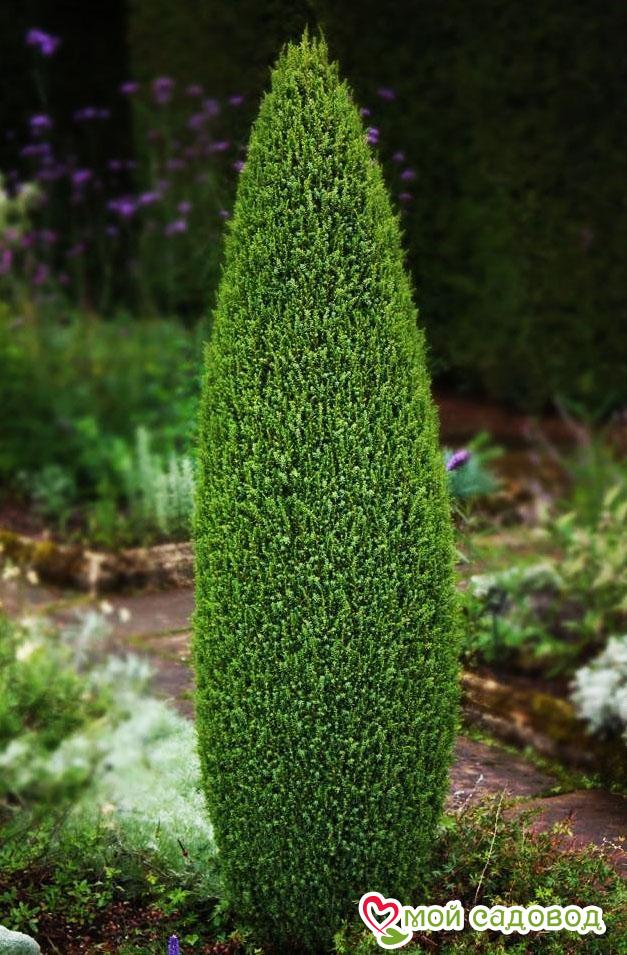 Можжевельник обыкновенный Компресса Данный сорт можжевельника встречается в лесах Европы, Северной Африки, Сибири, Северной Америки и Восточной Азии. Благодаря необычному внешнему виду и неприхотливости в уходе растение быстро завоевало популярность среди садоводов. С выращиванием хвойника справится даже новичок. Ботаническое описание Можжевельник обыкновенный Компресса — декоративный карликовый многолетник со средней силой роста. Годичный прирост составляет около 1 – 2 см в диаметре и 2 – 3 см в высоту. Взрослый экземпляр вырастает до 1 м. Максимальная ширина кроны – 30 см. Крона компактных размеров, с плотно прижатыми ветками. Хвоя очень тоненькая, игольчатая, длиной 4 – 6 мм. Окрас у неё голубовато-зелёный. Применение Узкая и густая крона можжевельника обыкновенного Компресса отлично смотрится в разных садовых композициях. Хвойник благополучно переносит обрезку, что позволяет создавать из него роскошные геометрические фигуры – пирамиды, шары и т. д. Миниатюрная колонна достойно украсит каменистый сад, аллею, хвойную и смешанную группу. Агротехника Саженцы можжевельника обыкновенного Компресса рекомендуется размещать на солнечных участках и лёгких нейтральных грунтах. Оптимальный интервал между растениями равен 0,5 – 2 м. Посадочную лунку делают в 2 раза шире и глубже земляного кома. На дне обустраивают дренажный слой из керамзита, песка, мелкой гальки или битого кирпича (достаточно 20 см). Корневую шейку сильно не заглубляют – она должна находиться на уровне поверхности почвы. Почвенную смесь для заполнения углубления готовят из дерновой земли, песка и торфа в пропорции 1:1:2. После высадки рассаду обильно увлажняют в течение недели. Уход за приобретёнными в питомнике саженцами не сложный. Всё что нужно – вовремя поливать многолетник, особенно при длительном отсутствии осадков. Отзывчив хвойник и на дождевание по кроне. Обрезка проводится по мере необходимости, в начале весны или по окончании лета. В удобрениях можжевельник обыкновенный Компресса практически не нуждается. Весной и в осенний период нужна профилактическая обработка средствами, содержащими медь. Приствольную зону для сохранения влаги и защиты корней от перегрева мульчируют опилками или листвой. В конце февраля – начале марта увеличивается солнечная активность. Лучи отражаются от снега и становятся ещё ярче. Если у можжевельника нет притенения, то возникает риск образования ожогов. Особенно это касается открытой части кроны, которая максимально обращена к солнцу. Чтобы защитить молодое деревце его укутывают мешковиной, крафтовой бумагой, картонными щитами или белой тканью. Перечисленные материалы хорошо рассеивают свет и не мешают циркуляции воздуха. Однако важно не закрывать нижнюю часть растения, которая расположена под снегом. В противном случае есть вероятность её выпревания. Преимущества можжевельника обыкновенного Компресса Как и многие хвойники можжевельник обыкновенный Компресса обладает многими достоинствами. Среди основных из них выделяют: высокую морозостойкость; приспособленность к городскому климату; универсальность в применении; лёгкость размножения. Даже без замачивания в стимуляторах роста можно получить около 40% прижившихся черенков. Купить рассаду можно не только в торговых организациях и магазинах, занимающихся об